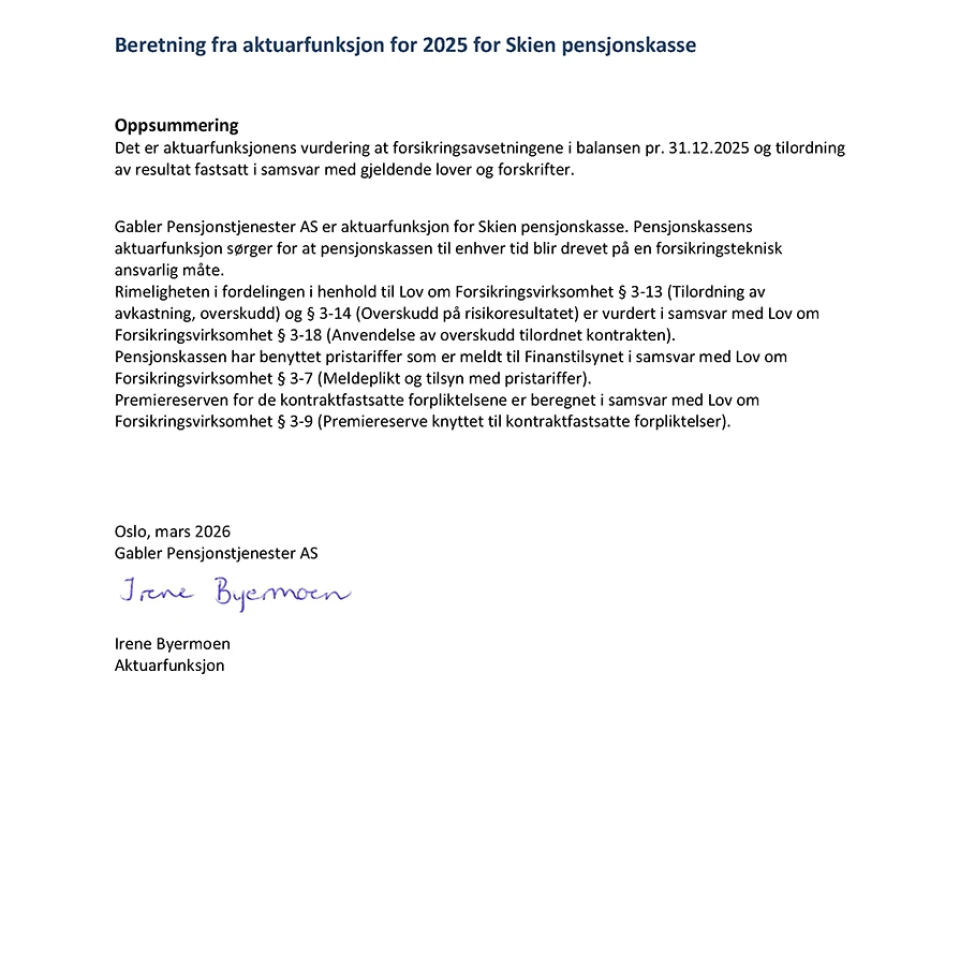 Skien pensjonskasse vil fortsette å prioritere bærekraftsarbeid i årene fremover, med fokus på bedre forståelse av klimarisiko og tilpasning til nye lovmessige og rapporteringsmessige krav i 2026.